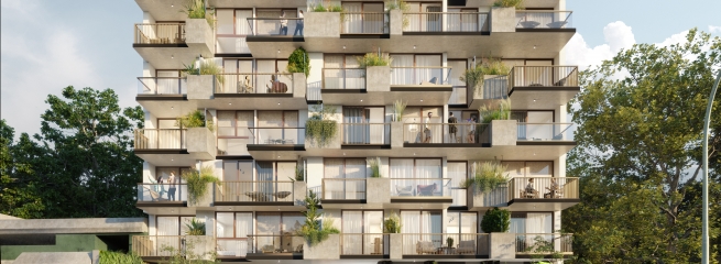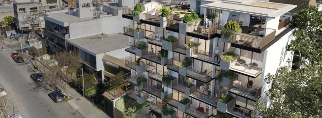 Todas las unidades cuentan con una gran expansión exterior (balcones, terrazas o jardines) con vegetación incorporada.