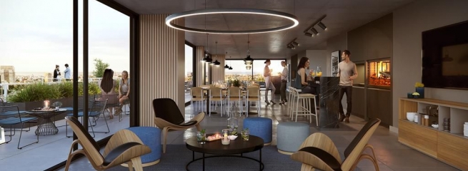 Edificio compuesto por 10 pisos, en los cuales vamos a encontrar 160 apartamentos monoambientes de 1 y 2 dormitorios y 2 locales comerciales en planta baja.