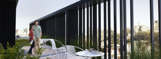 El edificio está formado por 2 torres de apartamentos de 1 dormitorio y monoambientes, y 1 subsuelo de estacionamientos. Se complementa con una terraza en la torre calle con amenities de primer nivel.
