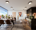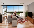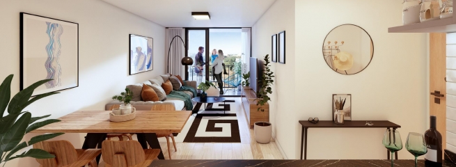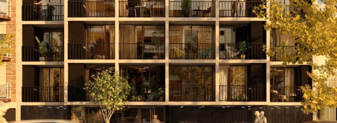 El edificio que cuenta 59 apartamentos, 24 apartamentos de 2 dormitorios, 34 apartamentos de 1 Dormitorio + 1 apartamento mono ambiente en piso 1.