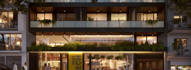 MET TECH es un edificio 13 pisos disponibilidad de apartamentos monoambiente, 1 y 2 dormitorios todos con terrazas o patios.