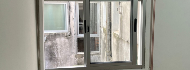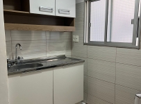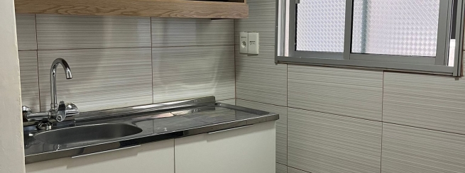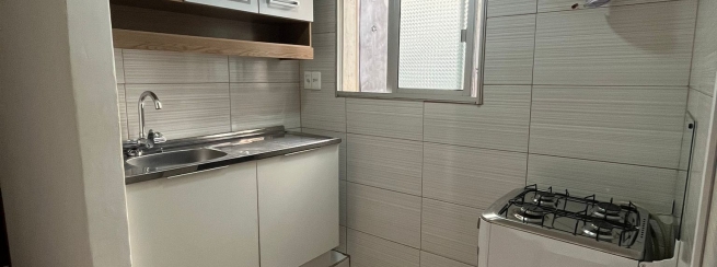 Cocina moderna con ventilación e iluminación natural, mueble bajo mesada y sobre mesada con piso de porcelanato.