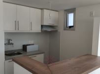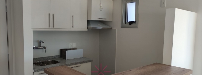 Living comedor con cocina semi definida y barra pasa platos. Desde el living se accede a terraza de 20m2 a través de puerta ventana doble.