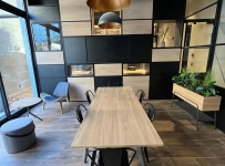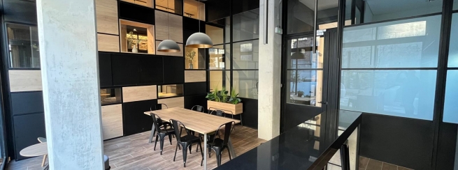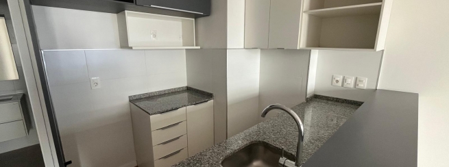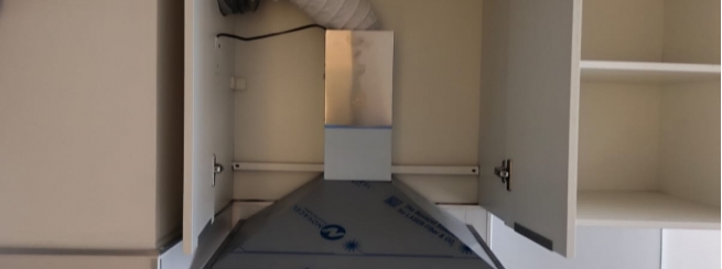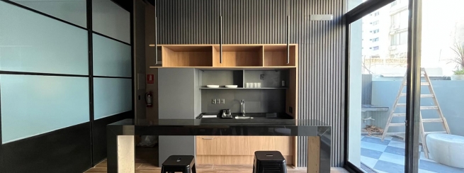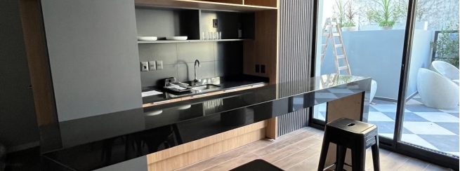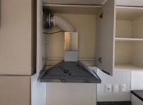 Cocina integrada muy práctica con campana instalada, muebles aéreos y bajo mesada.