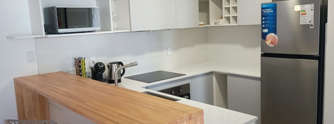 Cocina integrada, muy práctica y con muebles bajo mesada y campana extractora.