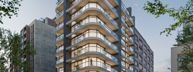 Cuenta con 12 pisos, compuestos por 34 unidades de 1 dormitorio, un apartamento de 2 dormitorios y un local comercial. 2 subsuelos destinados a plazas de estacionamiento.