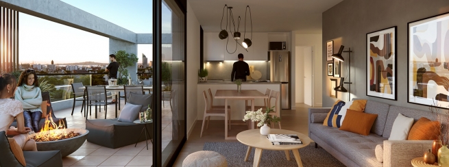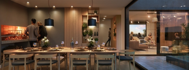 En piso 11 se ubica un espacio polivalente para trabajar o para armar tureunión, con parrillero interior, cocina equipada, mesa, living con smart tv y dos terrazas solarium con muebles de exterior y fire pits.
